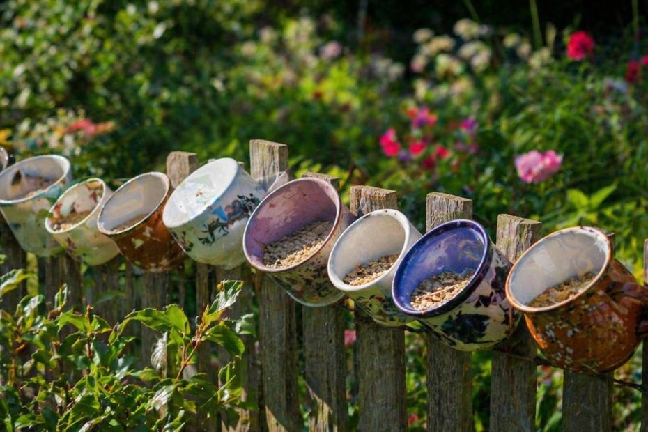 A prima vista sembrano solo una trovata carina: qualche tazza vecchia appesa alla recinzione, magari sbeccata, colorata, rimasta in fondo…